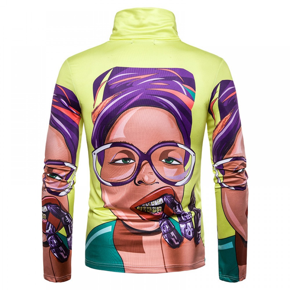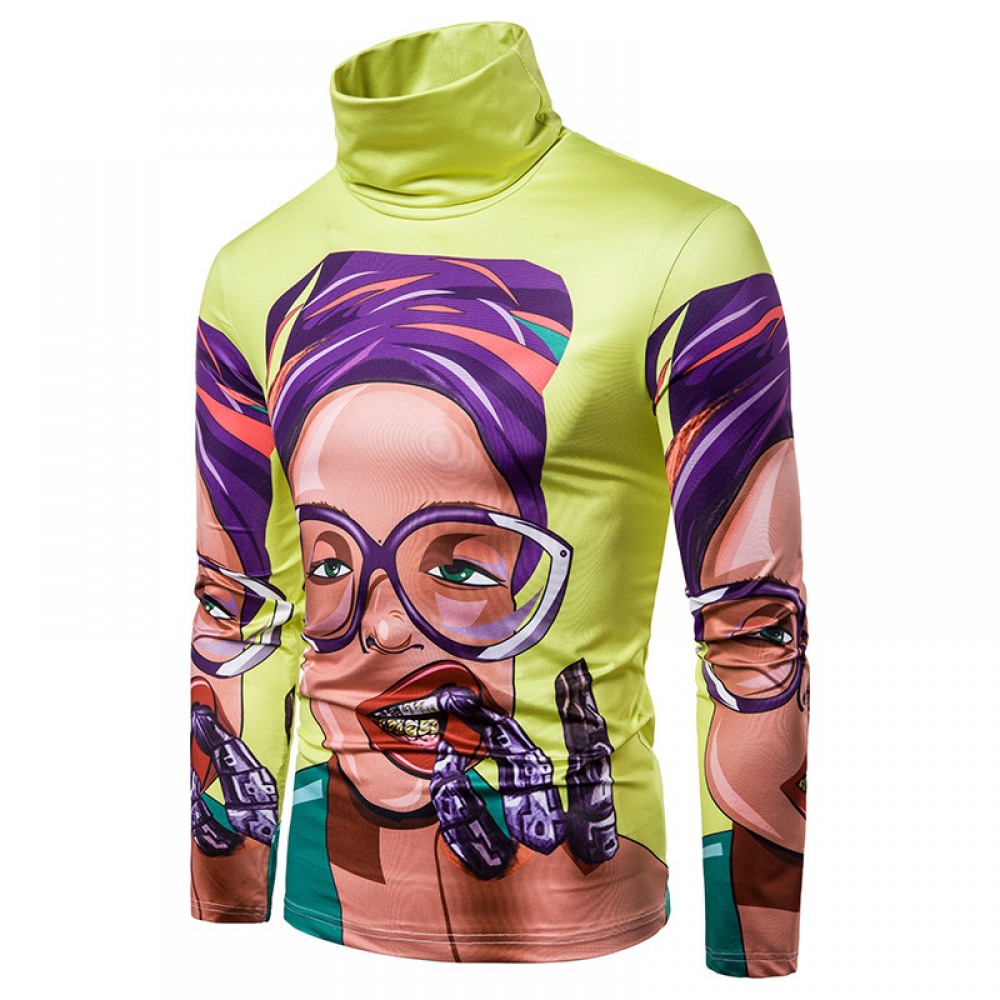 New Men's Large Size 3D Color Character Print High Neck Long Sleeve T-Shirt Bottoming Shirt